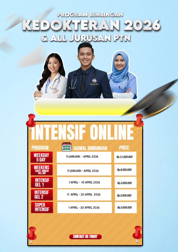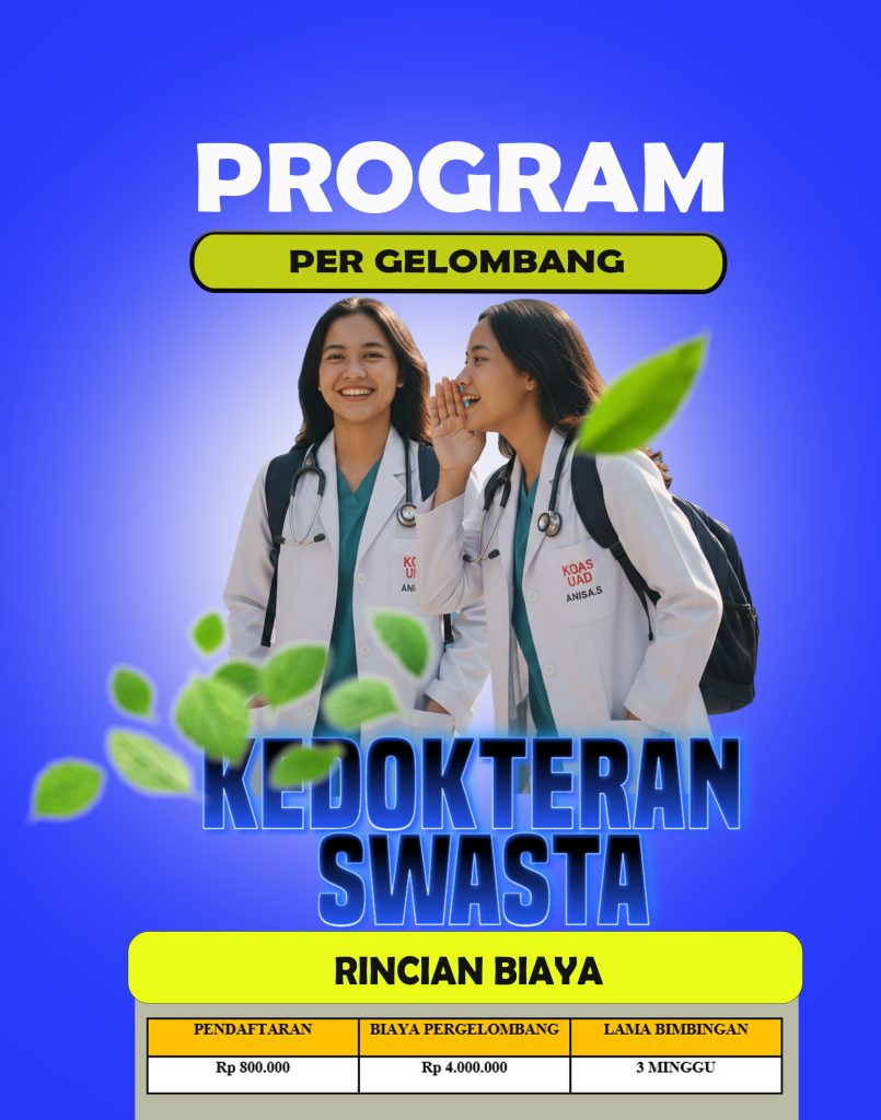 Bimbingan belajar (bimbel) kedokteran swasta untuk persiapan tahun 2026 berfokus pada strategi intensif untuk menembus Fakultas Kedokteran (FK) Bimbel Khusus Kedokteran Swasta: Fokus pada materi ujian mandiri PTS seperti Bimbel CBT UII,UMY,UAD atau persiapan FK Trisakti, Atma Jaya, dan Yarsi.persaingan kedokteran begitu ketat maka dari itu kami mempersiapkan diri untuk adik -adik akan mempersiapkan diri dengn lebih matang dalam mempersiapkan diri untuk meraih cita cita terbaik