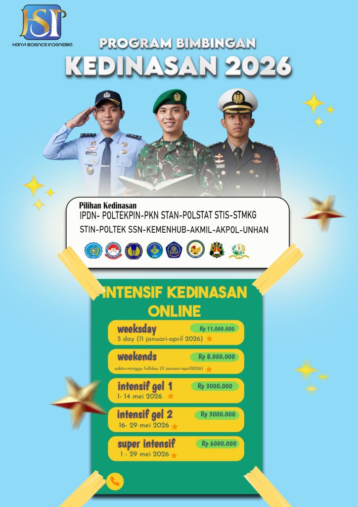 bimbingan belajar khusus untuk lulus tes masuk Perguruan Tinggi Kedinasan seperti PKN STAN, IPDN, STIN, STMKG, dan sekolah Kemenhub. Mempersiapkan diri dengan materi soal Materi SKD (Seleksi Kompetensi Dasar) CPNS terdiri dari tiga tes utama: Tes Wawasan Kebangsaan (TWK) (Pancasila, UUD 1945, NKRI, Bhinneka Tunggal Ika), Tes Intelegensia Umum (TIU) (verbal, numerik, logika, analisis), dan Tes Karakteristik Pribadi (TKP) (pelayanan publik, jejaring kerja, sosial budaya, TIK, profesionalisme, anti radikalisme), yang bertujuan mengukur kemampuan dasar peserta sebagai calon aparatur negara melalui sistem CAT. Persiapkan terbaik untuk melampaui Passing grade (nilai ambang batas) Sekolah Kedinasan 2026 dengan nilai terbaik